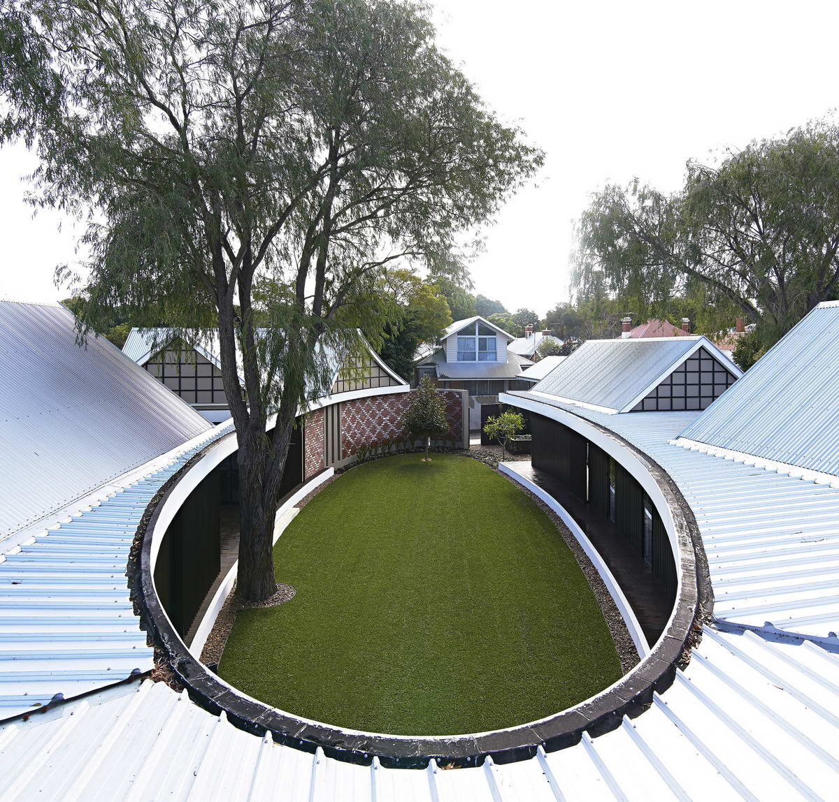 Дом с овальным двором (The Subiaco Oval Courtyard) в Австралии от Luigi Rosselli. Типичный для австралийских пригородов одноэтажный жилой дом оказался с секретом — внутри он имеет великолепный эллиптический двор. Сам дом буквально распластался по всей территории участка вокруг двора с одиноким большим деревом. Четыре спальни, расположенные в отдельном «крыле», выходят в изогнутый длинный коридор, который, в свою очередь, граничит с двором. Общая зона с кухней, столовой и гостиной открывается как во двор, так в крытую террасу. Название: Дом с овальным двором (The Subiaco Oval Courtyard)