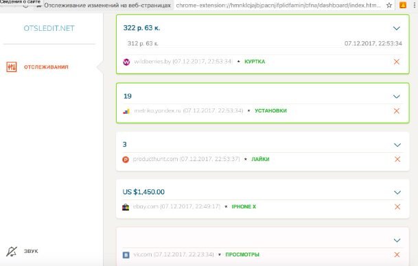 Вы можете мышкой указать, какой конент на сайте вы хотите отслеживать. Когда он изменится, вы получите сообщение в браузере. Также в расширении можно настроить звуковое уведомление. В любом случае уведомление приходит, если контент на сайте изменился. Но при этом в расширении нет возможности настроить частоту проверки изменений на сайте. Да и уведомление, кроме как через браузер, в котором установлено расширение Otsledit, не получить. И конечно же такое приложение не позволяет строить графики с историей изменения цен. Несмотря на небольшие недостатки, расширение может оказаться очень полезным п