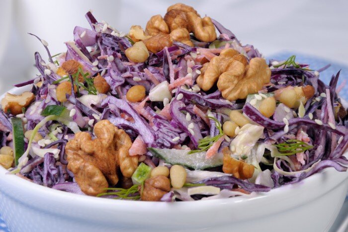 Салат из краснокочанной капусты отлично подходит для легкого и быстрого перекуса, а также как гарнир к котлетам, отбивным и другим мясным илирыбным блюдам.