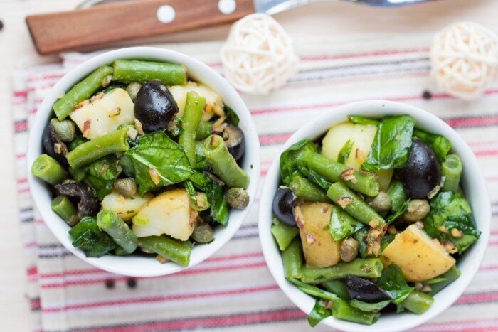 Картофель отвари в мундире до готовности, остуди, и нарежь крупными кубиками, сложи в большой салатник.На небольшом количестве оливкового масла обжарь спаржевую фасоль, в течении 5 мин. Остуди и добавь к картофелю.Шпинат промой и не крупно порви, оливки порежь вдоль напополам.Добавь в салат подготовленные шпинат, оливки и капер