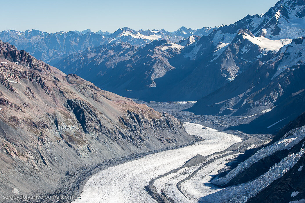 Гора Кука - высочайшая точка Новой Зеландии (3754 метров). Аэропорт, откуда мы взлетали, был недалеко от ее подножия. Мы выехали заранее и пару раз останавливались по дороге, чтобы сфотографировать гору. Позже мы облетим ее вокруг: