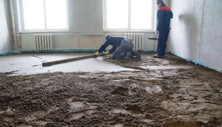 Начните процесс укладки стяжки с угла, противоположного ко входным дверям. В комнату занесите емкости с приготовленным цементно-песчаным раствором и приступите к его укладке его между маяками. Мастерком распределите и выровняйте раствор, добиваясь его более плотной укладки, а затем беритесь за правило.