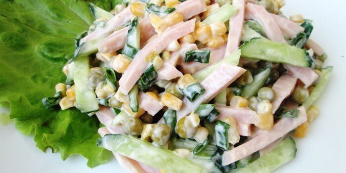 Состав салата рассчитан на быстрое приготовление из часто встречающихся ингредиентов, которые найдутся в любом холодильнике. Рекомендуется дополнить базовый рецепт по своему усмотрению, добавив другие компоненты. Замените майонез смесью сметаны и зелени, обжарьте ветчину перед закладкой, украсьте пищу, присыпав сверху веточками петрушки, укропа. Ингредиенты: Ветчина куриная – 150 г. Огурчики свежие – 300 г. Лук зеленый – 50 г. Куриное яйцо – 160 г. Майонез провансаль - 80 мл. Сыр Гауда – 50 г. Приготовление: 1.Огурчики промойте, разделите вдоль оси на четыре равные части. Нарежьте тонкими