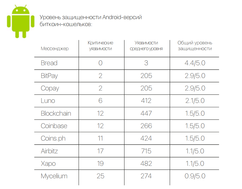 Специалисты компании Solar Security проверили безопасность популярных приложений, предназначенных для операций с криптовалютами. В основу проведенного исследования (PDF) легли отчеты, автоматически сформированные с помощью решения Solar inCode, которое использует методы статического, динамического и интерактивного анализа кода и способно проверять уровень защищенности приложений без доступа к их исходному коду. Эксперты изучили десять наиболее популярных мобильных приложений. Каждое из них рассматривалось в двух реализациях – для мобильных операционных систем iOS и Android. Blockchain, Coinbase, Coins.ph и Xapo для Android были скачаны свыше миллиона раз каждое. Это самые скачиваемые приложения в своем классе. Copay, Mycelium и Luno были загружены из Google Play свыше 500 000 раз. Помимо этих явных лидеров в исследование также были включены кошельки Airbitz, BitPay и Bread, которые не достигли отметки в полмиллиона скачиваний, однако, аналитики Solar Security приняли во внимание, что и