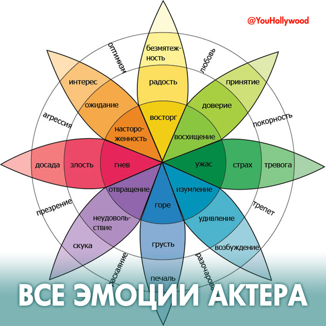 Сперва ЛАЙК, как обычно. Молодцом! 👍👍 Я обещал рассказать обо всех возможных эмоциях человека. Были такие ученые: Келлерман и Плутчик. Еще в 62-м году ими был опубликован труд, который вообще-то к актерам не имел никакого отношения. Он был о психологии и защитных процессах в организме. Долгая история. Чем это поможет нам? А дело в том, что это "колесо чувств" описывает все эмоциональные состояния человека. 6 основных направлений: ВОСХИЩЕНИЕ, ВОСТОРГ, НАСТОРОЖЕННОСТЬ, ИЗУМЛЕНИЕ, ГНЕВ, УЖАС, ГОРЕ и ОТВРАЩЕНИЕ. Они парно-противоположны друг другу. На соседних эмоциях возникают дополнительные чувства (любовь, покорность, трепет) итд. Просто внимательное изучение этой таблицы даст тебе исчерпывающее понимание всех форм человеческих эмоций. 🤔 Что может быть важнее для актера? Можешь и теорию Плутчика почитать, но это долго, нудно и не совсем из нашей оперы. Достаточно знания обо всех видах и связях эмоций в организме человека. Теперь можешь вернуться к актерской "карте эмоций", если пла
