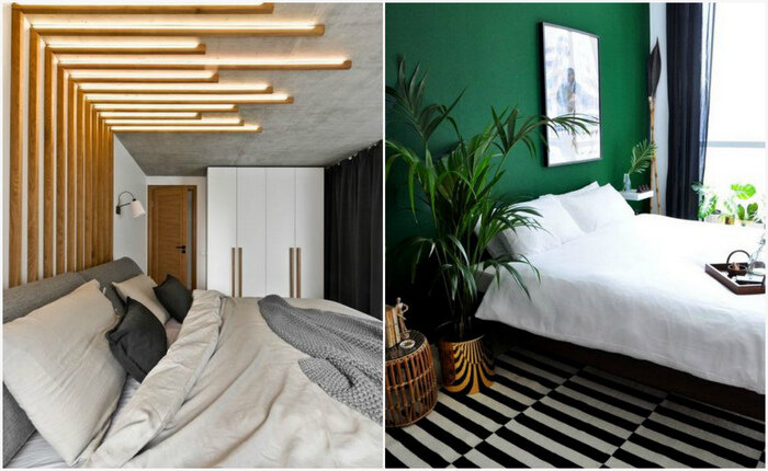 Можно также продумать точечную или фантазийную подсветку потолка. Очень интересно и необычно смотрится подсветка кровати или пола. Ищите свой особенный вариант, который позволит создать волшебную атмосферу в спальне в тёмное время суток.
