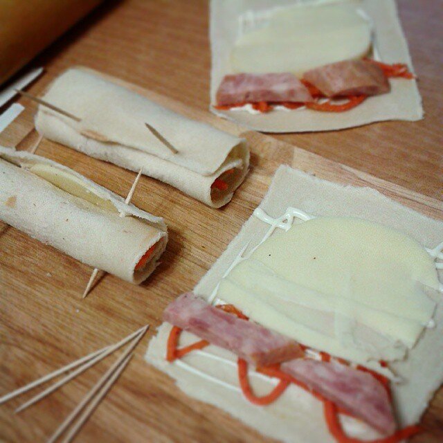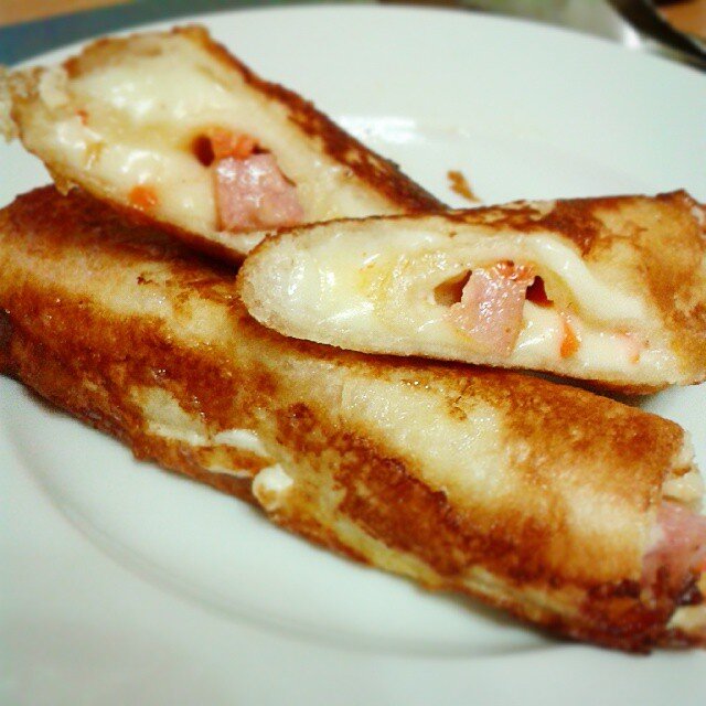 Тостовый хлеб без корок (4 ломтика) хорошенько раскатываем скалой. Раскладываем начинку - в моём случае это корейская морковка, немного майонеза, сыр и кусочки колбасы. Заворачиваем и, если есть опасность что рулетики могут развернуться, скалываем зубочистками. 1 яйцо смешиваем с щепоткой соли и 2-3 ст.л. молока. Обмакиваем в эту смесь рулетики. Не спешите, пусть немного впитают в себя жидкости. Жарим на растительном или сливочном масле с четырех сторон.
