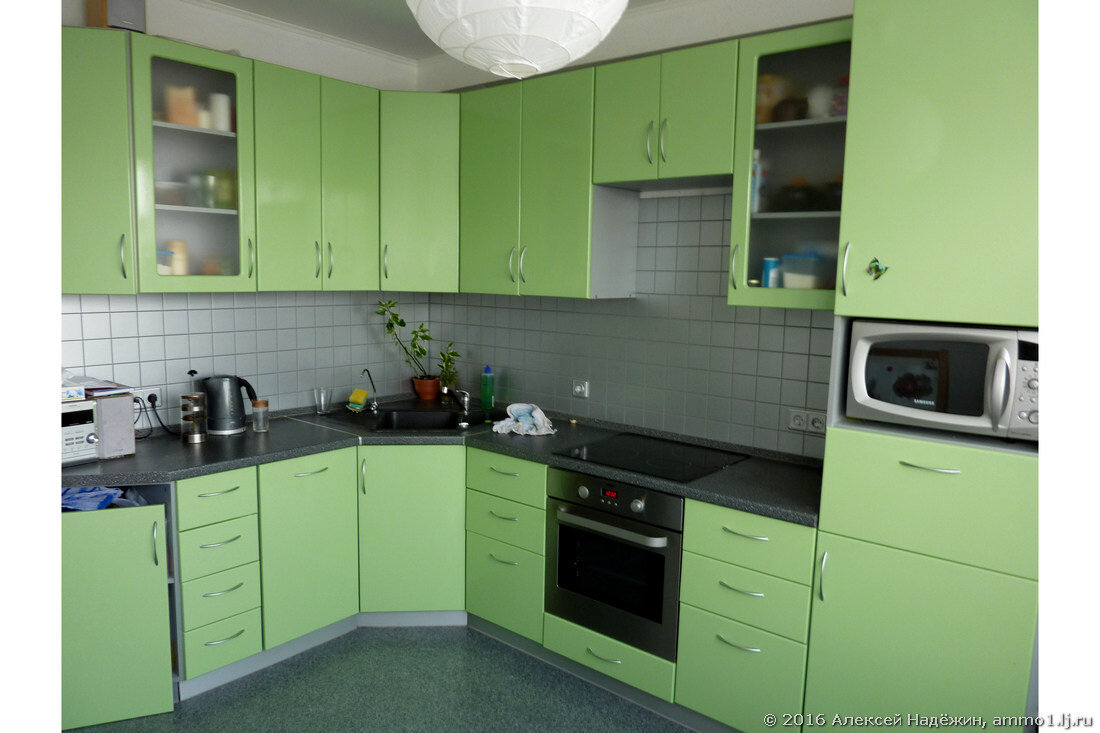 Вот эта кухня с дорогой немецкой столешницей с угловым элементом, фасадами, покрытыми цветной плёнкой, и большим количеством ящиков обошлась мне в 2010 году в 60000 рублей за всё, включая бытовую технику.