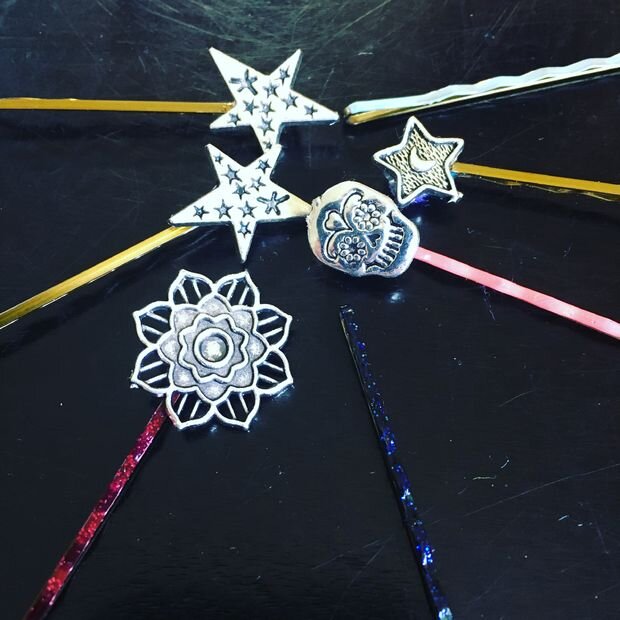 Сейчас я расскажу вам, как обновить ваши невидимки с помощью недорогих, но милых украшений. Обещаю, процесс создания аксессуаров для головы придется вам по вкусу! Материалы 1. Зажимы для волос, 2. горячий клей, 3. украшения (подвески в моем случае), 4. плоскогубцы, 5. войлок (необязательно), 6. лак для ногтей (необязательно), 7. блёстки (необязательно). Подготовка материалов Для начала удалите кольцо для цепочки с подвесок. Это, как правило, легко выполнить с помощью плоскогубцев. Металл не слишком крепкий, поэтому кусок должен отвалиться сразу. Вы можете использовать пилочку, чтобы сгладить края. Попробуйте сделать невидимки более красочными – покройте их лаком для ногтей. Так как заколки будут в ваших волосах, их, возможно, не будет видно, так что это не обязательно. Не используем войлок! В зависимости от типа подвески, которую вы используете, вы можете не подкладывать кусочки войлока, а сразу приклеивать украшения к невидимке. Особенно, если у них много отверстий и разветвл