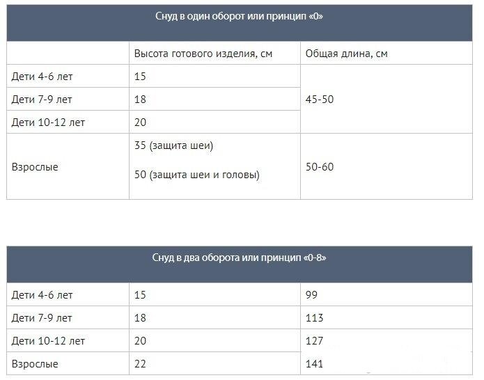 Прежде чем вы начнете вязать снуд спицами, следует рассчитать размер будущего изделия. В этой таблице вы найдете рекомендации по выбору параметров для детского снуда и хомута для взрослых. По этим параметрам вы можете связать снуд в один оборот, а от ширины изделия напрямую зависит, будет ли закрыта от холода только шея или шея и уши. Ведь широкий снуд заменяет капюшон, который будет сохранять ваше тепло и защищать от переохлаждения. Для «взрослого» снуда в два оборота необходимо добавить к длине 80 см. Снуд спицами с жемчужным узором Переходим к вязанию простого и стильного снуда жемчужной вязкой. Чтобы узор получился еще более выразительным, используйте пряжу секционного окрашивания в составе 49% шерсти и 51% акрила (300 г, метраж 684 м). Вязать шарф снуд мы будем на круговых спицах под номером 4,5. Длина готового изделия будет составлять 140 см. В начале работы набираем 224 петли. Пошагово процесс работы на круговых спицах вы можете рассмотреть на схеме. Набырной край для снуда выг