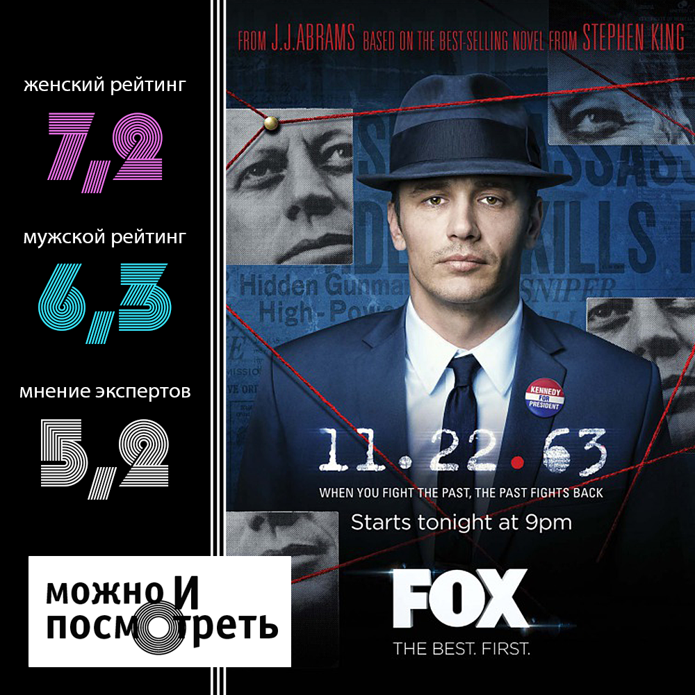 Рейтинг: девочки – 7.2, мальчики – 6.3, киноманы – 5.2, imdb – 8,2 Жанр: машина времени Общая информация: 2016 год, 1 сезон из 8 серий по 60 минут, экранизация романа Стивена Кинга Резюме: можно и посмотреть Аналоги: Continuum (2012), Timeless (2016) Развёрнутый отзыв: Довольно продуманный и только слегка налажавший в деталях проект засыла в 60-е годы прошлого века молодого человека, привыкшего к смартфонам. Там его ждут любовь, непонимание и слежка за Ли Харви Освальдом. Девочки, здесь есть прекрасная Сара Гадон, она украшает своей актёрской игрой этот сериал. Мальчики, сложные отношения героя со временем, людьми 60-х и самим собой немного скучноваты, но достойны просмотра. Киноманы, ну, шедевр слегка не вышел, но вы никогда и не ждёте особо ничего от Джеймса Франко, не так ли?