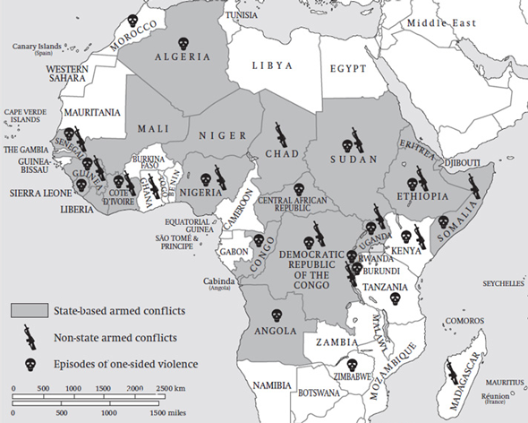В последние десятилетия за Африкой прочно утвердилась репутация самого конфликтоопасного региона нашей планеты. Поэтому ее все чаще стали именовать континентом конфликтов, или, более образно, кипящим континентом. Действительно, за полвека, прошедших со времени начала крушения колониальной системы, в Африке произошло 186 государственных переворотов, 26 крупномасштабных войн и несчетное количество разного рода конфликтов меньшего масштаба. В этих войнах и конфликтах погибло не менее 7 млн человек, а общий материальный ущерб от них составил 250 млрд долл. На протяжении многих лет и даже десятилетий болевыми точками на континенте оставались Ангола, Сомали, Судан, Заир (ныне Демократическая Республика Конго), Руанда, Бурунди, Либерия, Нигерия, Эфиопия, Мозамбик, Западная Сахара, Уганда, Чад, Мавритания, некоторые другие страны. При этом, по мнению Генерального секретаря ООН Кофи Анана, Африка представляет собой единственный район мира, где число конфликтов год от года не только не уменьшается, но даже возрастает.