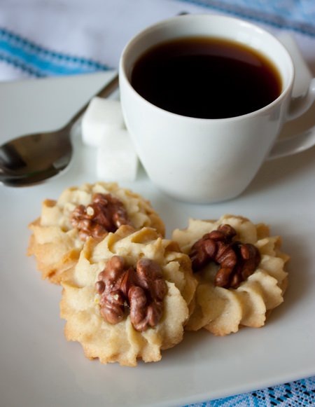 Печенье со вкусом мандаринок, благодаря добавлению цедры этого цитруса, очень рассыпчатое! Попробовав такое печенье дети будут в восторге. Ингредиенты: Размягченного сливочного масла 200 г Мука 240 г Сахарной пудры 100 г Цедра мандаринов 3-4 шт Картофельного крахмала 2 ст.л. Приготовление 20-30 минут Масло взбиваем с сахарной пудрой до кремообразного состояния. Добавляем мандариновую цедру и перемешиваем. Муку просеиваем с крахмалом и смешиваем с маслом до получения гладкого однородного теста. Перекладываем тесто в кондитерский мешок с насадкой-звездочкой и отсаживаем на застеленный пергаментом противень небольшие печенья. Украшаем каждое печенье половинкой грецкого ореха. Ставим противень в разогретую до 180 градусов и выпекаем печенье в течение 15 минут до золотистого цвета. Охлаждаем и подаем.
