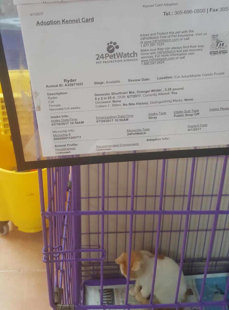 Четыре дня назад пользователь с ником danknissan пришёл в отделение Общества защиты животных США в Майами и увидел сидящего в клетке маленького рыже-белого котенка, ждущего, пока кто-то его заберет. Кошечку звали Райдер, она жила в приюте уже около двух месяцев.