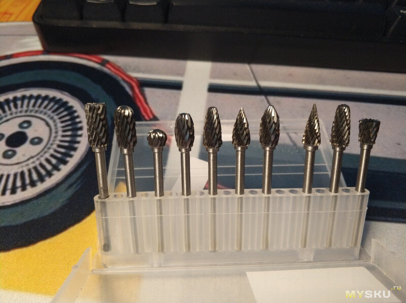 Обзор борфрез с хвостовиком 3мм для использования в граверах. Неожиданно хорошие борфрезы. Просматривая ассортимент али случайно наткнулся на данный набор. Не питал особых иллюзий относительно материала и качества, но данные борфрезы меня приятно удивили. Поставляются фрезы в пластиковом кейсе. Указан размер режущей части и хвостовика. Все фрезы имеют диаметр 6мм и хвостовик 3мм Внешний осмотр показал что режущая часть отличается от хвостовика, имеется малозаметный след от пайки латунным припоем. Размеры фрез соответствуют заявленным на упаковке. Длина хвостовика 35мм. После внешнего осмотра можно проверить фрезы на биение. На максимальном вылете имеется небольшое биение. На глаз десятая миллиметра. Если зажать максимально глубоко, насколько позволяет патрон, биений нет или они незаметны глазом. Тест драйв проводился исключительно с металлами... ► Расширенная версия обзора доступна на сайте MYSKU.ru В итоге: Шарошки понравились, отличный инструмент. Продавец не обманул — режущая част