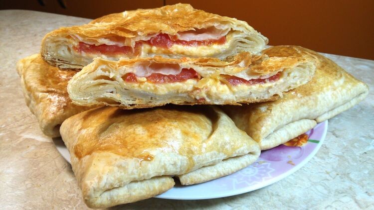 Предлагаю вам рецепт нестандартного хачапури. А почему бы и нет? Если вы хотите разнообразить свой завтрак, а может и просто полакомиться вкусной выпечкой за чашечкой чая, попробуйте приготовить эти хачапури. Нам они очень понравились, оцените и вы) Понадобится: 1 упаковка слоеного дрожжевого теста 200 грамм твёрдого сыра 2 помидора пучок укропа чеснок соль по вкусу Приготовление: Тесто разморозить и нарезать квадратами со стороной примерно 10 см. Сыр нарезать квадратами, чуть меньше, чем тесто или потереть на крупной тёрке. Помидоры вымыть и нарезать тонкими кружочками. Чеснок и укроп мелко порубить, смешать с солью. На середину каждого квадрата теста положить кружочек помидора, сверху посыпать укропом с чесноком, накрыть сыром. Свернуть в виде конверта или треугольником, как получится, это не столь важно. Выпекать в разогретой духовке 30-40 минут до румяной корочки. Дать немного остыть и можно пробовать. Приятного вам аппетита) Подписывайтесь на мой канал, делитесь моими рецептами, г