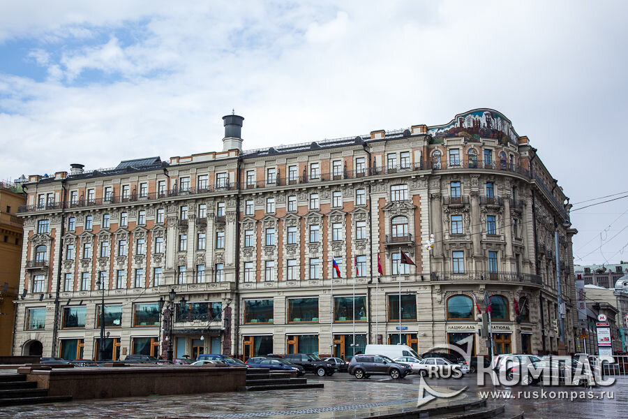 Что сохранилось, а что изменилось в "Национале" с 1903 года? Гостиница "Националь" не только одна из самых фешенебельных и престижных гостиниц в Москве, но и памятник архитектуры с более чем столетней историей. С момента своего основания, "Националь" стал излюбленным местом пребывания самой взыскательной публики: политиков, театральных знаменитостей и даже членов императорской семьи. До 1900 года на углу Моховой и Тверской улиц располагались каменные мучные лавки, меблированные комнаты и известный многим москвичам трактир "Балаклава" К своему открытию 29 декабря 1902 года "Националь" насчитывала 170 номеров и салонов. Самые дорогие и роскошно отделанные апартаменты были на 3 этаже гостиницы - номер 101 "Гостиная Людовика XVI" и номер 115 "Гостиная Людовика XV". В настоящее время эти номера называются просто - "Президентские люксы". Знакомство с гостиницей начнем с главного входа. С 1905 года его украшает металлический козырек с грифонами и с датой открытия гостиницы - 1903 год.