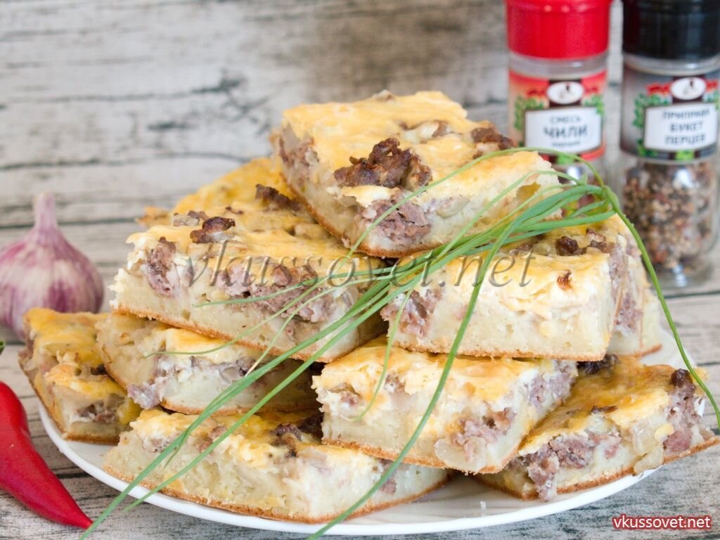 Заливной пирог с фаршем Рецепт приготовления заливного пирога с фаршем и сыром. Этот пирог чаще всего называют «гости на пороге». Откуда такое название? Для приготовления этого сытного, питательного и ароматного пирога берутся продукты которые практически у всех хозяек имеются под рукой: для мясной начинки немного мясного фарша и лука, для теста – кефир, яйца и мука, а для заливки – сыр и яйца. Остальное дело за духовкой. Существует несколько вариантов его приготовления – пирог можно выкладывать в форму различными слоями и добавлять любые специи и приправы. Необходимые ингредиенты: - 600 г. фарша (смешанного); - 3 луковицы; - соль и специи по вкусу. Для теста: - 1 стакан кефира (комнатной температуры); - 4 яйца (комнатной температуры); - 1 ч. ложка соды; - 180 г. сливочного масла (размягченного); - 1 ст. ложка сахара; - 450 – 500 г. пшеничной муки; - соль по вкусу. Для сырной заливки; - 300 – 400 г. сыра (полутвердого); - 3 яйца. Для смазывания формы; - 1 ч. ложка сли