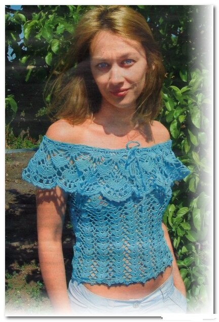 Вы любите воздушные кофточки? Тогда предлагаю Вам связать этот топ с круглой ажурной каймой. Смотрится великолепно и при чём в разных расцветках. В работе не сложный, да и пряжи мало идёт. Знакомьтесь со схемами. Потребуется 200г пряжи (хлопок) и крючок №3.