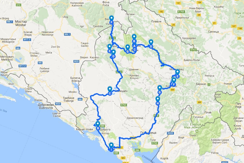 2 день (на карте): панорама Чуревац – подъемник на Савин Кук – мост Дужрджевича – каньон Тары – нацпарк Биоградская гора – Колашин и ресторан «Савардак» – монастырь Морача – подвесной мост на реке Морача – дорога домой