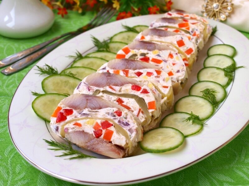 Эта закуска смотрится оригинально и ярко, при том вкус ее легкий, приятный, ведь все продукты в этом рецепте отлично сочетаются, вызывая аппетит и желание отведать еще кусочек. Попробуем приготовить? Уверяю, это совсем не сложно! Мы с вами возьмем такие продукты: - 1 тушку слабосоленой селедки; - 1 небольшую морковь; - 1 соленый или маринованный огурец; - 1 красный болгарский перец; - 1 яичко; - 200 мл сметаны; - 1 луковицу (в идеале – фиолетовую); - 40 мл воды; - 15 г желатина; - половину чайной ложечки свежевыжатого лимонного сока; - соль, перчик по своему усмотрению. Также к этому списку можете добавить любимую зелень. Она придаст закуске свежие и сочные нотки. Для начала очистим и выпотрошим сельдь, разделим на две части вдоль и аккуратно удалим косточки. Это достаточно просто сделать при помощи обычного пинцета. Яйцо и морковь отвариваем до готовности, после чего чистим и измельчаем кубиками. Лук тонко и мелко нарезаем, то же самое проделываем со сладким перцем. Растворяем же