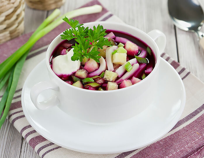 600 г свеклы · 500 г кальмаров · 3 картофелины · 2 зеленых яблока · 2 огурца · 1 пучок зелени · 1 ст. ложка уксуса · соль. Готовим: 1 Свеклу моем, чистим. Кладем в кастрюлю, заливаем 1,5 — 2 л воды. Добавляем уксус, ставим на огонь. Варим до готовности 40 минут. Свеклу вынимаем, режем соломкой, отправляем в холодильник. Отвар процеживаем через марлю, полностью остужаем. 2 Картофель моем, очищаем, отвариваем до готовности. Яблоки и огурцы споласкиваем, очищаем. Подготовленные овощи и фрукты нарезаем соломкой или кубиками. 3 Кальмары размораживаем. Очищаем от пленки, промываем. Кладем в подсоленную кипящую воду, варим 4 — 5 минут. Откидываем на дуршлаг, промываем под холодной водой. Измельчаем. 4 В кастрюлю кладем свеклу, картофель, яблоки, огурцы, кальмары. Заливае