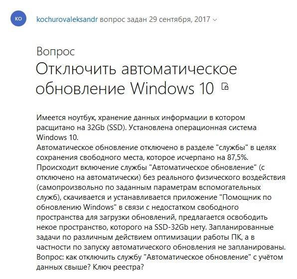 А вы знали, что если вы отключите службу автоматического обновления операционной системы Windows, то нарушите этим три кодекса Российской Федерации: административный, гражданский и уголовный? А именно так считают сотрудники Майкрософт. На самом деле паниковать не нужно, потому что никаких судебных прецедентов в России по этому поводу не было. И вряд ли будут. Но давайте все же узнаем аргументацию специалистов Microsoft, сначала поняв причины, по которым пользователи отключают автоматическое обновление Windows? 1. Нехватка свободного места. Пожалуй, самая популярная причина. Windows 10 занимает от 20 до 30 Гб, не считая файлов подкачки и гибернации. Добавьте к этому папку Program Files и вы получите полностью забитый SSD-диск на 64 Гб. Или 120 Гб (если программ много). Поэтому приходится отключать автообновление, иначе размер папки Windows будет расти с каждым патчем и Виндоус в какой-то момент просто не сможет обновиться из-за нехватки места. 2. Безопасность. А вдруг оч