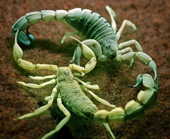 Скорпионы - это хищные паукообразные. Они имеют восемь ног и легко распознаются парой захватных клешней и узким хвостом, заканчивающимся ядовитым жалом.