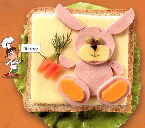 Еще один важный момент! Дети ничего не забывают. И не удивляйтесь, что через десяток лет вчерашние крохи вам так украсят стол, что удивляться и поражаться будете вы! А ведь на таких мелочах и стоит вся атмосфера в семье. Итак, креативный завтрак. Рассмотрим такое нехитрое дело, как бутерброд. Хлеб лучше взять зерновой, мой вам совет, а дальше – на ваше усмотрение. На некоторых фото вы встретите не совсем «детские» продукты – колбасу, например. Не советую ее давать детям, замените отварным мясом, овощами, сыром или яйцом. Помните, что в первую очередь, завтрак должен быть питательным и полезным! Конечно же, спросите вашего малыша, что он любит больш