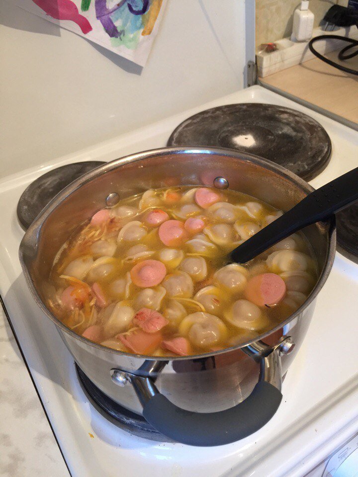 Надоело тратить кучу времени на приготовление супа? Да и устали от привычных вариантов? Так почему бы не вспомнить студенческую молодость и не приготовить себе суп пельменный "Студенческий обыкновенный"! На все про все - всего 20 минут. Сытно, вкусно, а главное быстро и совсем недорого. Итак, вам потребуется: Итого, все затраты на суп составят всего 100-120 рублей, а кастрюли хватит на 5-6 порций. Приготовление Залить в кастрюлю 3-3,5л воды и довести до кипения. Морковь потереть, лук мелко порезать, нарезать сосиску тонкими кружочками, все смешать и обжарить на сковороде. Воду в кастрюле посолить, закинуть в нее пельмени и снять пенку, когда она появиться. Дождаться, когда пельмени начнут всплывать (обычно через 5-7 минут) и добавить зажарку. Поварить еще 2-3 минуты, добавить лапшу, лавровый лист и приправу. Все тщательно перемешать и поварить еще 3-4 минуты. После выключения плиты желательно, чтобы суп еще немного потомился под закрытой крышкой. Примерно еще 5 минут. Вуаля! Ваш суп