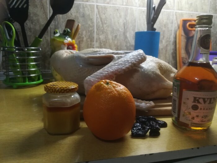 Про гусей ходит много шуток, одна из моих любимых: - За что вы не любите готовить гуся? - Почему же? Очень люблю, хорошая птица, на выходе килограмм жира, килограмм мяса и два килограмма костей… Нам потребуется: Гусь – 4 кг; Соль 2 кг; Винный уксус – 2 столовые ложки; Коньяк – 200 мл; Апельсин – 3 шт; Мед – 200 гр; Чернослив – 150 грамм; Перец черный – чайная ложка И так с чего же мы начинаем готовку гуся, а с… его маринованием, за 2 дня до готовки. Да-да, чтобы гуся запечь, его нужно хорошо подготовить, а именно просолить. Просто натерев его солью сверху – мы ничего не получим, даже выйдет так, что он быстрее сгорит снаружи, а внутри останется недопеченный и пресным, а потому берем емкость, в которую гусь уйдет с головой… т.е. по шею. Наводим соленый маринад так, чтобы по солености вода была раза в 2, а то 3 раза солонее, чем нам приятно по вкусу, и в отправляем тушку гуся, в «морское спа» на водные процедуры. Емкость убрать в прохладное и темное место. За 8 часов до готовки, и