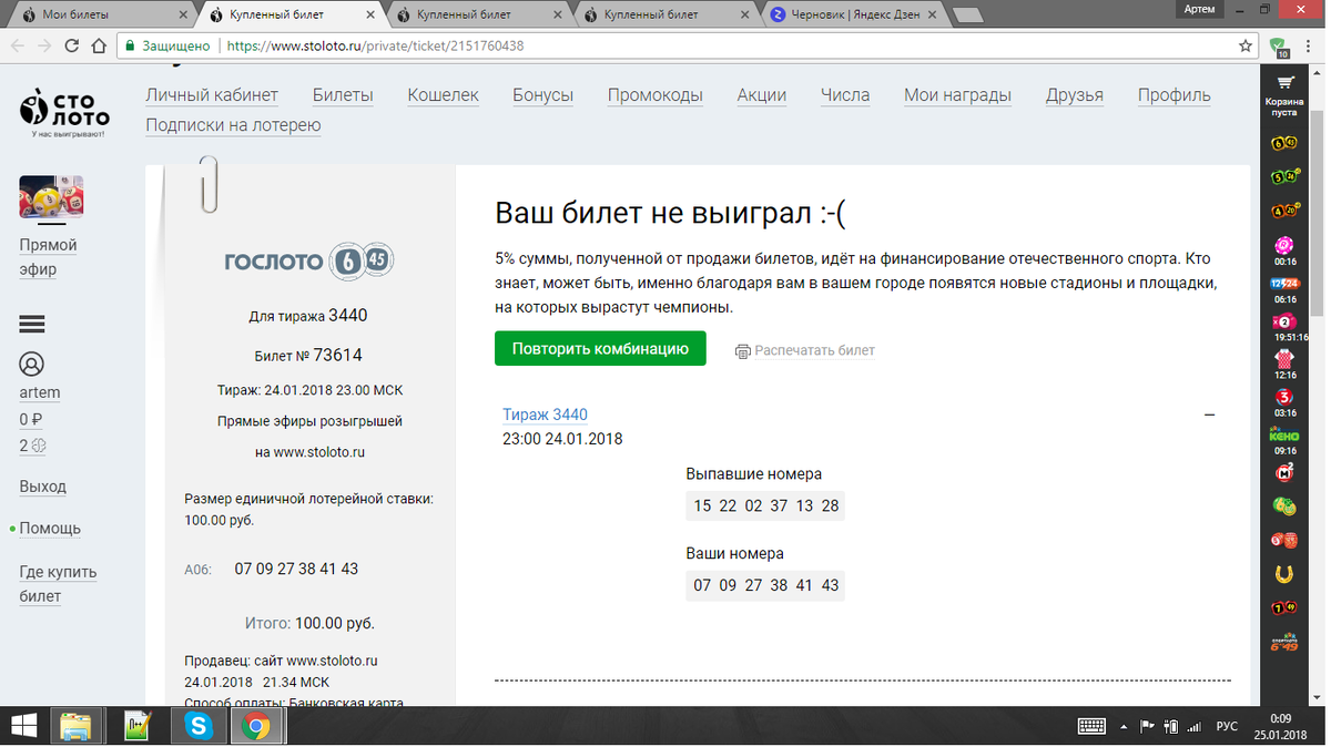 Вот и прошел тираж лотереи 6 из 45 №3440 и я, как и обещал, пишу про результат небольшого эксперимента. В предыдущей статье ("Хорошо ли работает автоматический выбор чисел на stoloto (реальная ставка)?!"), я попробовал сделать 3 автоматические ставки в данной лотерее и вот каков итог: из трёх комбинаций совпало только 1 число!) Результаты вы можете видеть на скриншотах: Вот как-то так и работает случайный выбор чисел на сайте) Стоит понимать, что лотерея на то и лотерея, что выигрывает один билет на миллион, поэтому не стоит обижаться на судьбу и организаторов! Добра вам и хорошего настроения!) Если вам понравилась статья, то нажимайте "палец вверх" и "+" наверху, чтобы подписаться на канал, а я, в свою очередь, постараюсь радовать вас интересным контентом!)