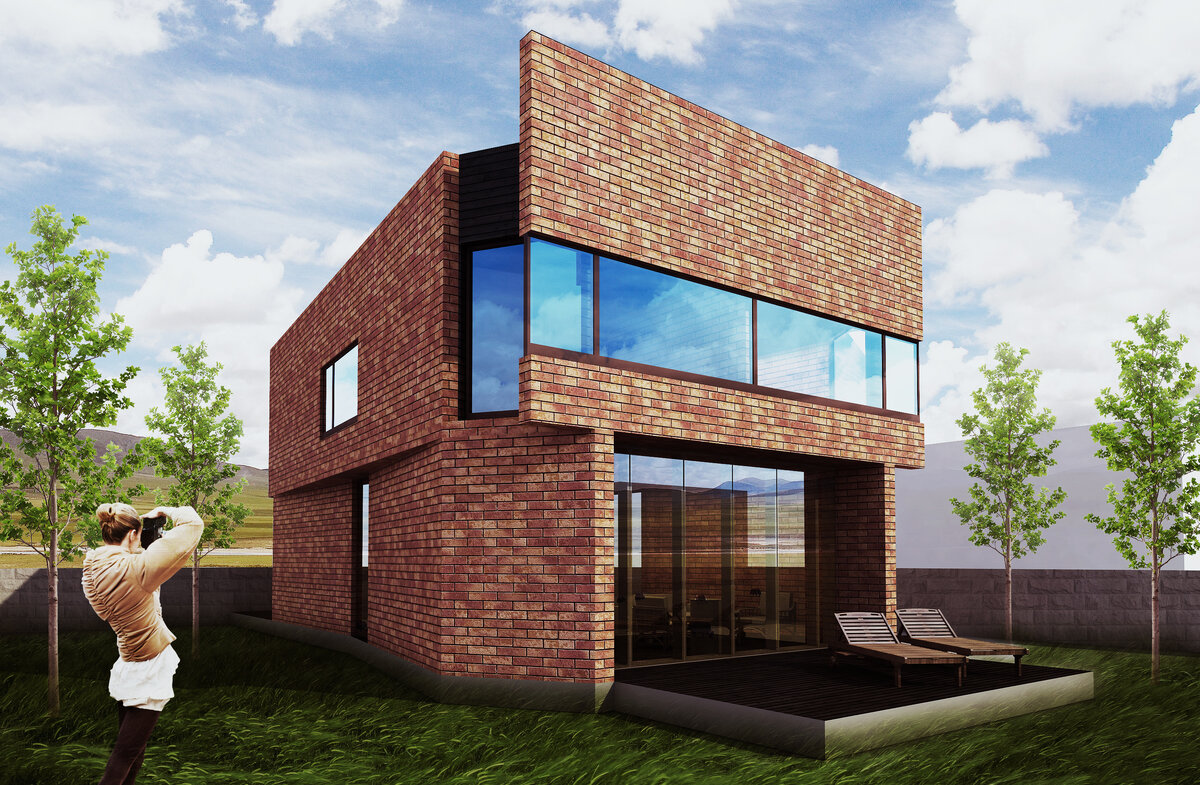 Идея и форма загородного дома «Тектоник» были заимствованы у природы. Источником вдохновения послужил процесс смещения тектонических плит, их деформация и наслаивание друг на друга. Подражая движениям блоков земной коры, дом собран из плит, деформированных под непривычным углом с учетом тектоники места. Брутальный дом из терракотового кирпича с черными деревянными вставками пытается замаскироваться под окружающий ландшафт. Кирпич не однороден по цвету, 5 оттенков выложены по колористической схеме и напоминают земные породы. А окна со слегка зеркальным эффектом отражают небо. Скульптура дома построена на контрасте земли и воздуха – тяжелые плиты в сочетании со сквозными окнами в пол и стеклянными дверями создают потрясающий эффект мощи и утонченной красоты. Главный фасад – плита, стоящая на углах соседних стен. Ее как будто выдвинуло на первый план огромной силой. Это не просто стена с панорамным окном, но и своего рода защитный экран дома. Угловые окна из хозяйской спальни и ка