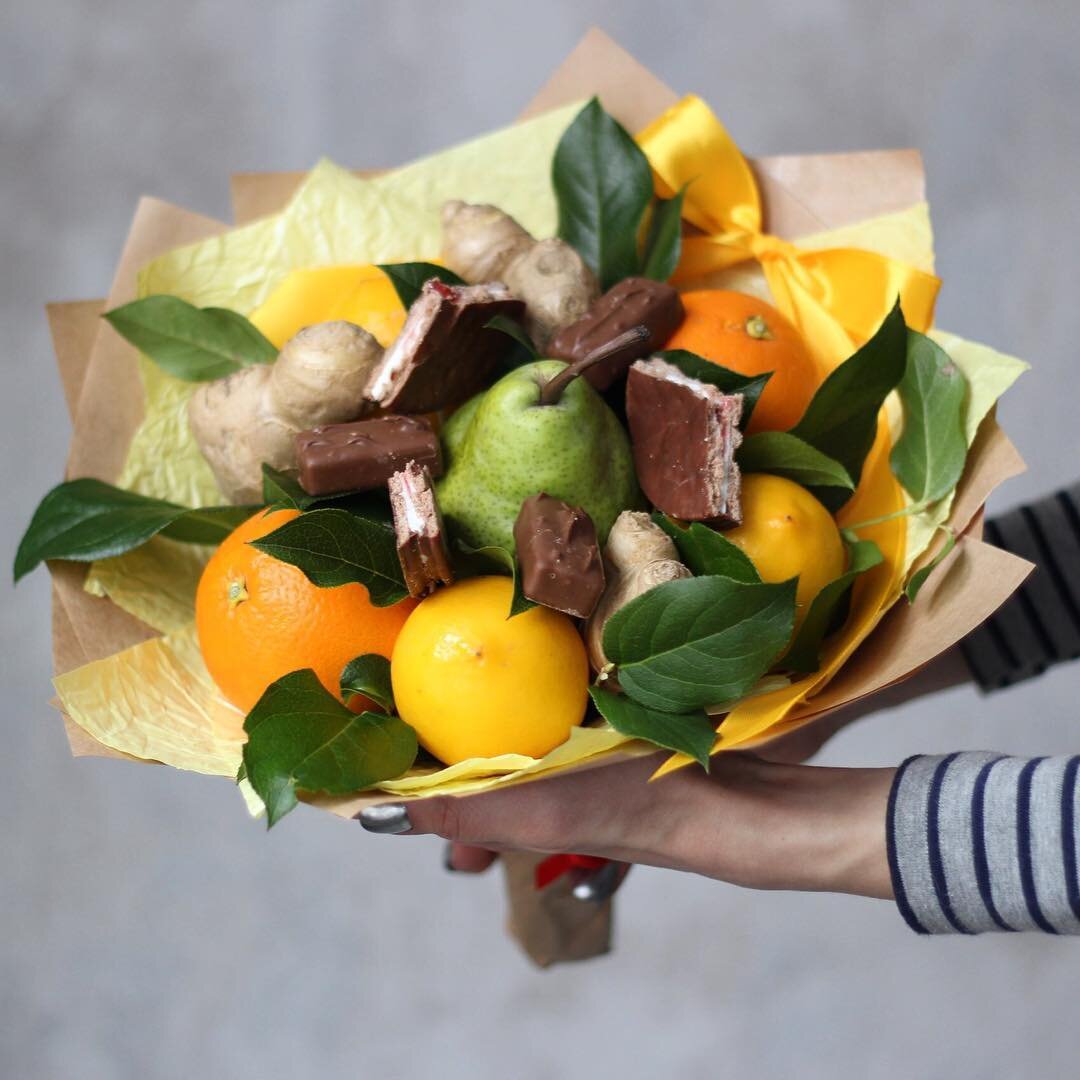 Самые оригинальные букеты этого сезона – букеты из фруктов. Спрос на такие букеты постоянно растет. Фруктовые букеты дарят на свадьбы, дни рождения, девушкам на день святого Валентина или на 8 марта, и даже мужчинам на 23 февраля! Мы в дизайн-мастерской «Букет Обед» занимаемся созданием фруктовых букетов и хотим подлиться с вами своими оригинальными идеями. 1. Милейший букет из лимонов, апельсинов и имбиря зарядит получателя витаминами, а сладости – эндорфинами. 2. Желтый букет символизирует богатство, мечту, смелость, радость и юность! Букет выполнен из медовых и сочных тайских манго, маракуйя, сливы, киви, лонгана, розы и альстромерии. 3. Этот букет мы назвали «Страсть». В состав букета входит ежевика и тёмный виноград. 4. Этот очень яркий и стильный букет получил название "Пламя". 5. Букет "Дарк мун" такой же загадочный и привлекательный, как Луна в ночном небе... Букет был сделан специально для съёмок в модном журнале. Прохожие сворачивали шеи,когда мы шли по улице с таким к