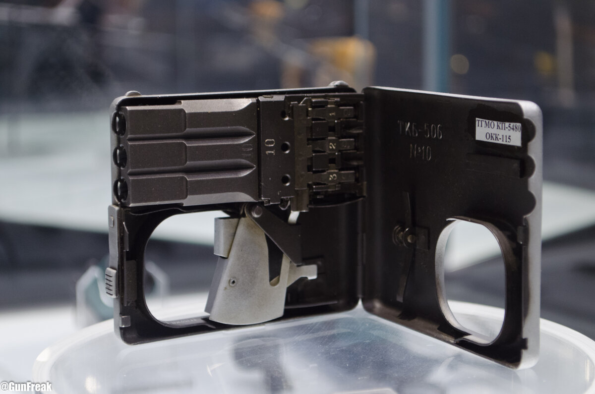 СССР, г. Тула. Центральное конструкторское исследовательское бюро спортивно-охотничьего оружия. 1955 год. КГБ желает получить на вооружение нечто эдакое и Игорь Яковлевич Стечкин создает для спецслужб пистолет ТКБ-506, получивший неофициальное название «стреляющий портсигар». По внешнему виду и габаритам пистолет действительно соответствовал названному предмету, за исключением сквозного окна со спусковым крючком и трех отверстий стволов. ТКБ-506 был предназначен для бесшумной и беспламенной стрельбы специальным патроном СП-2 с отсечкой пороховых газов. Подробнее об устройстве подобных патронов читайте в отдельном материале. В связи с тем что длина стволов всего 25 мм, для сохранения убойного действия пули стали изготавливать патроны с усиленным зарядом пороха. В качестве метательного средства применили капсюльный состав 12,7-мм крупнокалиберного патрона. Первые образцы СП-2 изготовил лично И. Я. Стечкин на базе заготовки гильзы патрона образца 1943 года. По понятным причинам в откры
