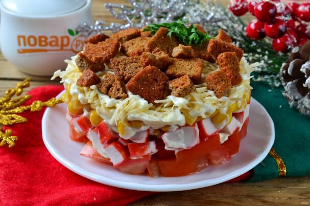 Даем салату слегка пропитаться, а затем аккуратно снимаем сервировочное кольцо. Вот и все, салат можно подавать! Приятного аппетита - ставьте лайк. Ингредиенты: Помидор — 2 Штуки Крабовые палочки — 100 Грамм Чеснок — 1 Зубчик Сыр твердый — 70 Грамм Консервированная кукуруза — 150 Грамм Сухарики — 50 Грамм Майонез — 3 Ст. ложки