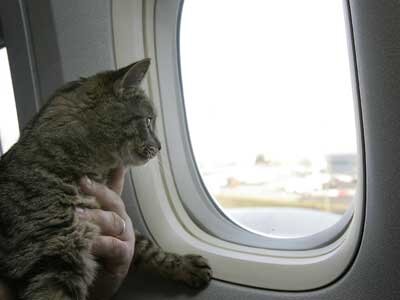 Кошки , одеты в красно-синие костюмы с надписью Petme («Приласкай меня»), гуляют по залу и общаются со всеми желающими пассажирами.