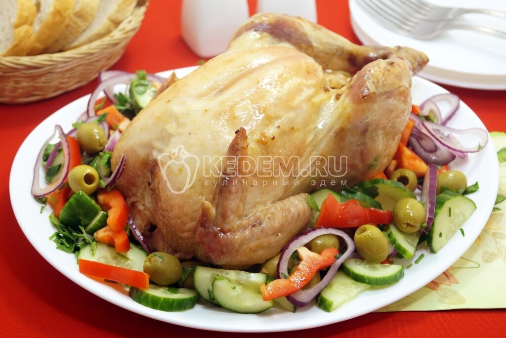 Соль1 ч. л. Приготовление: Курицу разморозить и хорошо обсушить. Связать ножки и тушку нитью. Добавить прессованный чеснок, а пару зубчиков вложить в тушку. Натереть снаружи прессованным чесноком и солью всю тушку. Выложить в форму для запекания и готовить в духовке, 15 минут при 200 градусах и 45-50 минут при температуре 180 градусов С. Готовую курицу хорошо пролить соком и дать немного остыть, снять нити. Курица в духовке целиком готова. Выложить на блюдо и подавать к столу с овощами и любимым гарниром. Приятного аппетита!