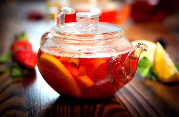 Чай с фруктовыми нотками. Ингредиенты: Чай каркаде 6 грамм Грейпфрут 1 долька Апельсин 1 долька Лимон 1 долька Мёд 40 грамм Кипяток 400 миллилитров Приготовление: В сотейнике чай каркаде залить кипятком, добавить фрукты и мёд. Довести до кипения. Затем перелить в чайник и настаивать 2 минуты. Приятного аппетита.