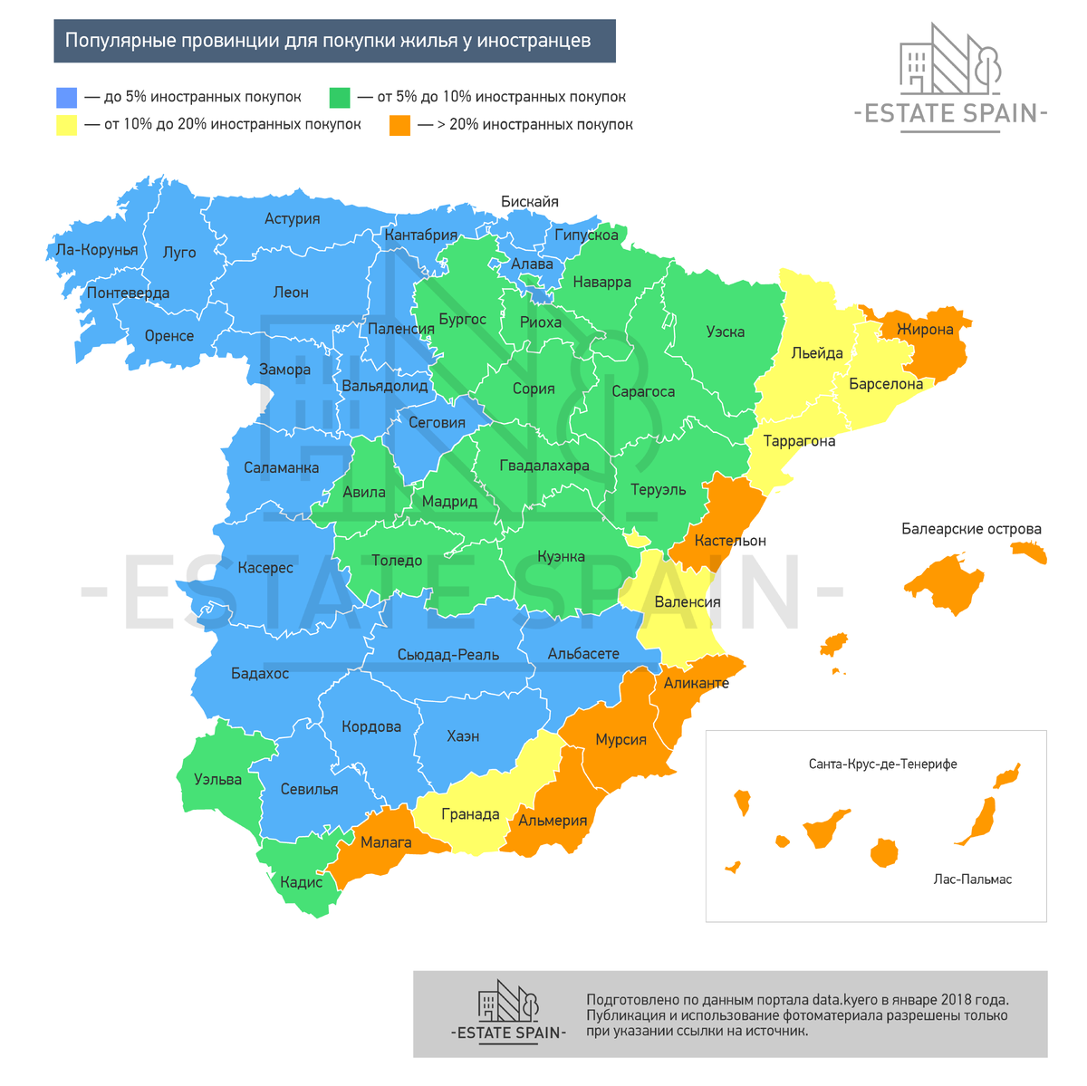 Обратите внимание не жёлтый и оранжевый цвета! Как вы можете заметить, чем ближе провинция к берегу Средиземного моря, тем она популярнее. Именно на юго-восточном побережье и островах находится бо́льшая часть курортного жилья. Изучайте инфографику и подписывайтесь на наши соцсети!