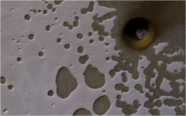 Можно подумать, что космический аппарат НАСА за 11 лет уже видел все на поверхности Марса, но картина, сделанная на Южном полюсе, выявила то, что мы не можем объяснить. Хотя вся поверхность планеты покрыта различными углублениями и кратерами, огромная полость в этом ландшафте значительно отличается. Она кажется, намного глубже, чем другие впадины. Многие вещи могут создавать дыры в скалистой местности Марса: более полумиллиона метеоритов создали многочисленные кратеры, коллапс вулканических пород создает глубокие ямы. Иногда зонд MRO встречает выдающуюся особенность местности, которая является загадкой, которую нужно решить. Посмотрите на эту фотографию: Летом на южном полюсе Марса солнце достаточно низкое, чтобы подчеркнуть тени над ландшафтом, благодаря чему открываются особенности местности. Свечение также показало лед на дне отверстия. Отверстие окружено замороженной двуокисью углерода. Вся структура напоминает швейцарский сыр, - шутки исследователей. Изображение было сделано с исп