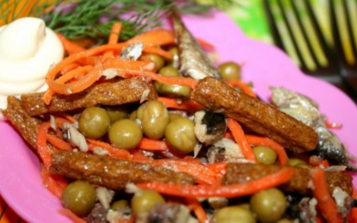 Приготовить наш салат проще простого. Разминаем вилкой рыбу, добавляем немного измельченную корейскую морковь, сухарики, горошек, майонез, перемешиваем и сразу подаем к столу. Приятного аппетита!