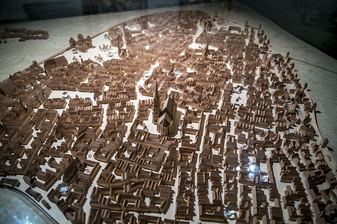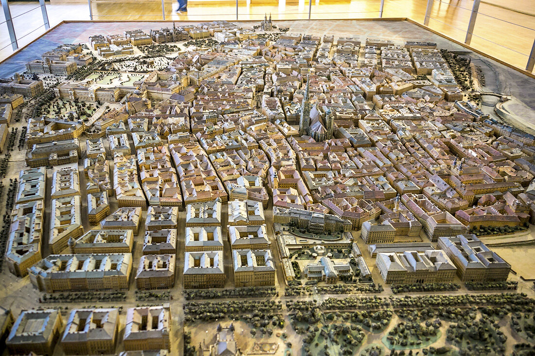 1. Вена веками была окружена крепостной стеной, что определило плотную застройку городских кварталов. Узкие улочки, вплотную стоящие дома с дворами-колодцами, небольшие торговые площади между ними. Это хорошо видно по макету, представленному в городском музее.