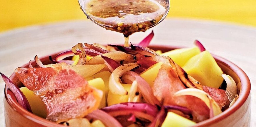 Сытный, вкусный и очень ароматный салат обязательно разнообразит обычный ужин. Теплый салат будет приготовлен из картофеля, бекона, колбасок и маринованных огурцов. Продукты Приготовление Подготавливаем продукты для теплого салата из картофеля. Картофель тщательно моем под проточной водой (можно мыть щеткой, чтобы кожура была идеально чистой). Нарезаем картофель средними дольками. Заливаем картофель водой и варим на среднем огне 20 минут до готовности. С готового картофеля сливам воду. Бекон кладем на сковороду. Обжариваем бекон на среднем огне, вытапливаем жир. Очищенный лук нарезаем небольшими перьями. Копченые колбаски нарезаем кружочками. Маринованные огурцы нарезаем нетолстыми кружочками. Петрушку шинкуем мелко. Когда бекон обжарится, перекладываем его на бумажное полотенце. В сковороду, в которой жарился бекон, кладем лук и колбаски. Жарим 3 минуты. Туда же добавляем измельченную зелень, сахар и уксус. Тушим, помешивая, 4 минуты. Когда уксус испарится, кладем в сковороду ка