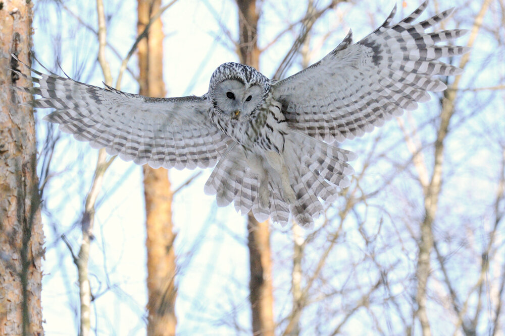 История с этим снимком для меня забавная. Из серии "глаза боятся, а руки делают") Стояли последние дни зимы. Я накопил немного денег и купил две вожделенных в то время вещи. Это объектив Nikkor 70-200 2.8 VR II и телеконвертер NikonTC-20E III Aspheric. Отправился со всем этим хозяйством в лес. Там у меня птицы были прикормлены, а к птицам - соответственно хищные птицы (ястребы), и мыши, которые подъедали остатки птичьего пира. Ну а на мышей неровно смотрят совы и лисы. И вот поставил я штатив, накрутил на него тяжелую штативную голову, присоединил фотокамеру с новым объективом и телеконвертером. Дай думаю, сделаю тесты резкости на снегирях. И тут краем глаза вижу - кто-то медленно вылез из сугроба и взлетел, потом сел на мертвую сосну. Присмотрелся - вау, да это же длиннохвостая неясыть. Вот тебе и удача - тесты новой оптики совпали с неожиданной встречей. Только вот ядрен батон - не готов я был. Я то пришел оптику тестировать, а не снимать динамические снимки) А сова на меня вним
