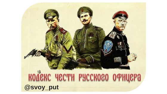 Кодекс чести русского офицера. Составлен в 1804 году, по-моему, актуален во все времена. 1. Не обещай, если ты не уверен, что исполнишь обещание. 2. Держи себя просто, с достоинством, без фатовства. 3. Необходимо помнить ту границу, где кончается полная достоинства вежливость и начинается низкопоклонство. 4. Не пиши необдуманных писем и рапортов сгоряча. 5. Меньше откровенничай — пожалеешь. Помни: язык мой — враг мой. 6. Не кути — лихость не докажешь, а себя скомпрометируешь. 7. Не спеши сходиться на короткую ногу с человеком, которого недостаточно узнал. 8. Избегай денежных счетов с товарищами. Деньги всегда портят отношения. 9. Не принимай на свой счет обидных замечаний, острот, насмешек, сказанных вслед. Что часто бывает на улицах и в общественных местах. 10. Если о ком-то не можешь сказать ничего хорошего, то воздержись говорить и плохое... 11. Ни чьим советом не пренебрегай — выслушай. Право же, последовать ему или нет, остается за тобой. 12. Сила офицера не в порывах, а в нер