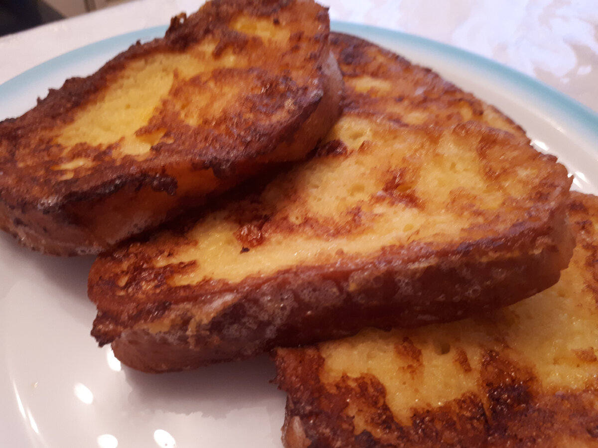 Иногда, когда не хочется заморачиваться с завтраком, я делаю своим домочадцам на завтрак гренки. Греночки получаются очень вкусными и сытными. Ингредиенты: 3/4 булки батона ( для гренок использую батон нарезной, но можно любой хлеб); 3 яйца; 1 стакан молока; 50 гр. масло сливочное; 2-3 ст.ложки растительного масла ( лучше без запаха); соль 1/4 ч. ложки. Приготовление: 1. Батон нарезать на ломтиками шириной 1 -1,5 см. 2. В отдельной посуде яйца размешать с с молоком и солью. 3. В сковороде разогреть растительное масло, добавить сливочное масло. СМЕСЬ МАСЕЛ ХОРОША ТЕМ, ЧТО ГРЕНКИ В НЕЙ НЕ ПРИЛИПАЮТ И НЕ ПОДГОРАЮТ. 4. Теперь берем по одному ломтику хлеба и окунаем с обоих сторон в смесь яиц и молока, на пару секунд. Затем тут же кладем в разогретую сковороду с маслом. 5. Жарим с обеих сторон до румяной корочки. Завариваем чай и приступаем к завтраку. Мои домочадцы любят гренки с медом или вареньем. Я люблю просто гренки с чаем.