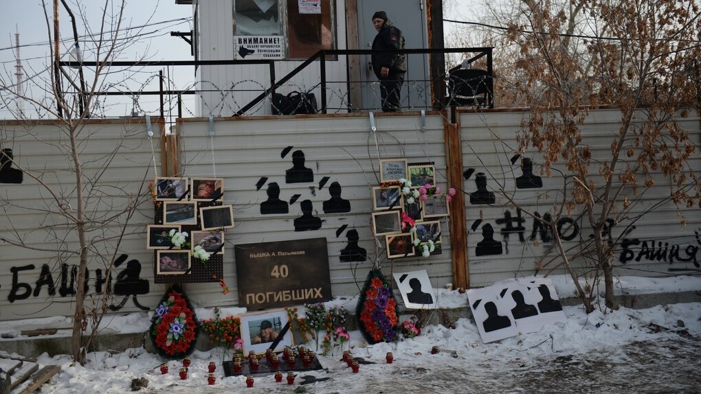 Неизвестные обклеили забор снимками трупов. У стен недостроенной телебашни в Екатеринбурге появился стихийный мемориал памяти 40 горожан, которые погибли, пытаясь ее покорить. Как передает корреспондент 66.RU, к забору, установленному вокруг объекта, неизвестные принесли фотографии с изображениями трупов, венки, зажгли свечи. На заборе нарисованы силуэты людей с черными лентами Среди атрибутов можно заметить черную табличку «Вышка Александра Пальянова. 40 погибших». Пальянов известен тем, что забирался на башню в строгом костюме и исполнял трюки, а также опрашивал тех, кто покорил недострой впервые. В 1998 г. он погиб. Кроме того, на самом заборе кто-то нарисовал черной краской из баллончика силуэты людей с черными лентами. Напомним, ранее подрядчик выкопал возле телебашни огромный котлован, в который и упадут обломки телебашни. Напомним, в октябре прошлого года Уральская горно-металлургическая компания определила подрядчика, который взорвет телебашню. Планируется, что место под лед