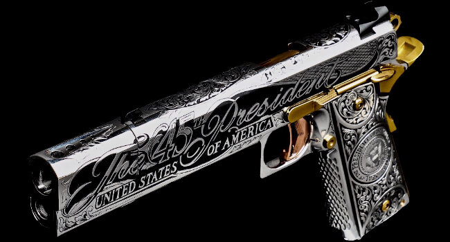 " Дональд Трамп — представитель старой школы семидесятых, при этом явно не обделенный деньгами, поэтому выбором декоративного материала стало золото." Так как Трамп является 45-ым президентом США, был выбран пистолет американский Colt 1911 в калибре .45 ACP. Джеймс использовал фирменную семидюймовую (17,7 см) раму Grandmaster X в качестве основы конструкции и добавил двухдю