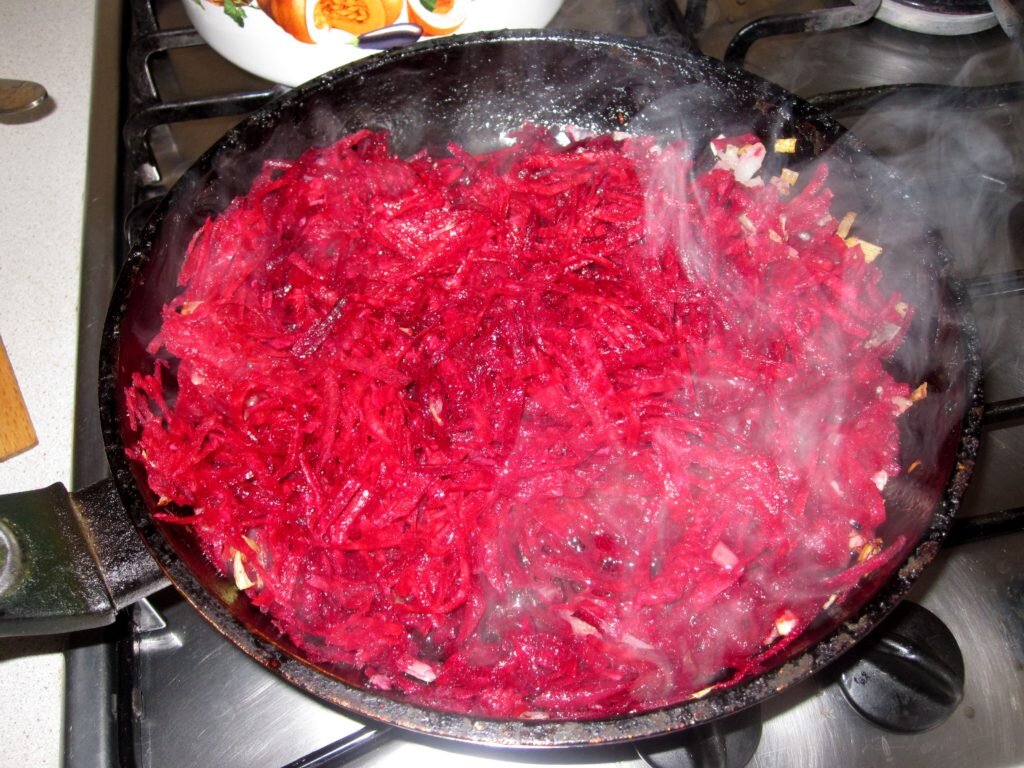 Пока картофель варится, можно приступать к приготовлению зажарки, так как чем дольше она будет томиться на небольшом огне, тем вкуснее получится борщ. Лук чистим, нарезаем кубиками, пассеруем в небольшом количестве растительного масла. Добавляем очищенную и потертую на крупную терку свеклу, морковь. Добавляем томат, перемешиваем, накрываем крышку, слегка притушиваем. Шампиньоны нарезаем не очень мелко, вот так: Отправляем грибы в зажарку, на небольшом огне тушим, периодически помешивая, до готовно